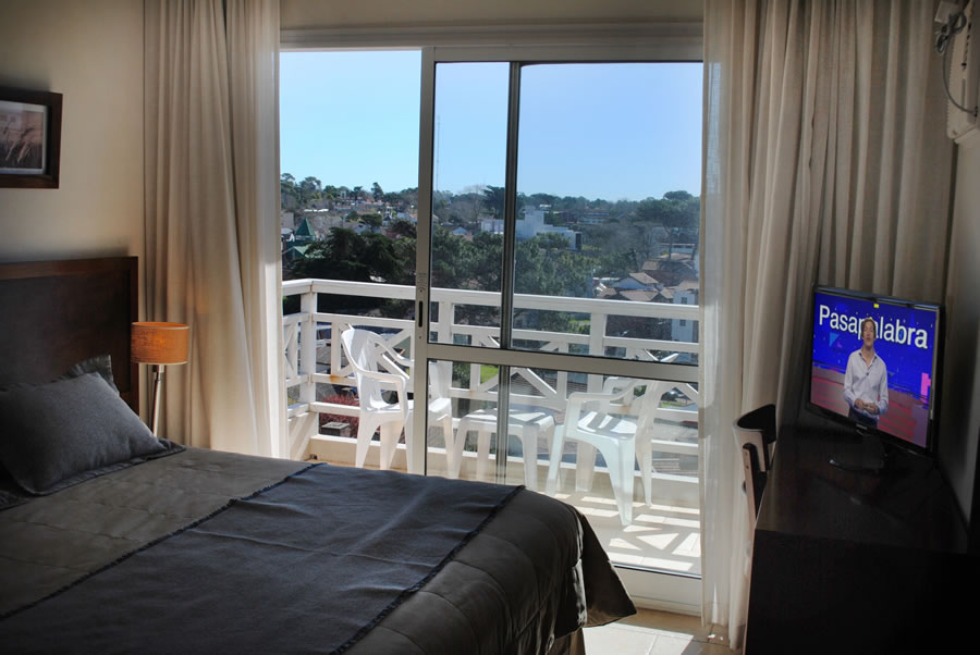 Nuestros apartamentos (60mts2, distribuidos en dos ambientes), cuentan con dormitorio al contra frente con balcón, con un juego de mesa y 2 sillas donde podrá contemplar unos atardeceres inolvidables.