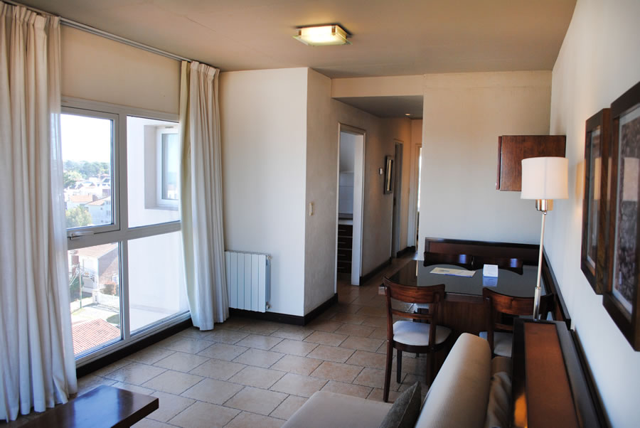 Nuestros apartamentos (60mts2, distribuidos en dos ambientes), cuentan con dormitorio al contra frente con balcón, con un juego de mesa y 2 sillas donde podrá contemplar unos atardeceres inolvidables.